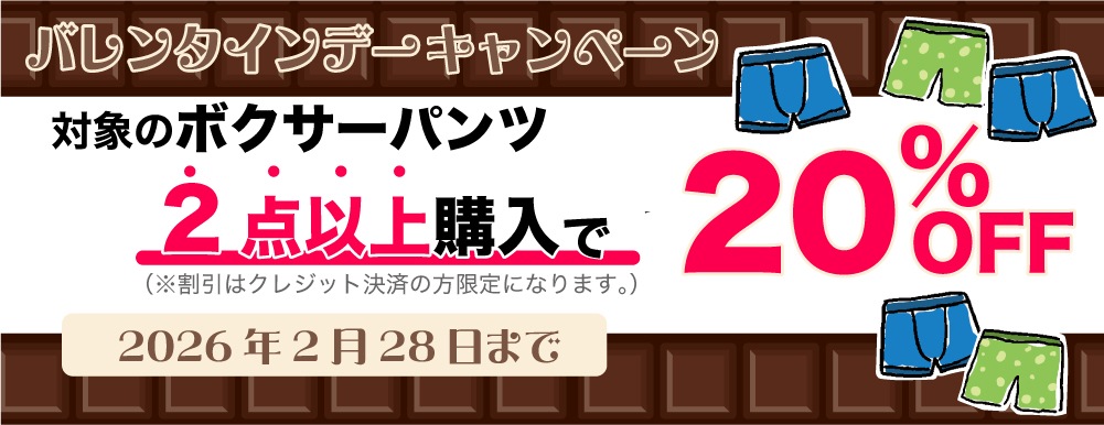 バレンタインデー特別施策:ボクサーパンツ2点以上購入で20%OFF!